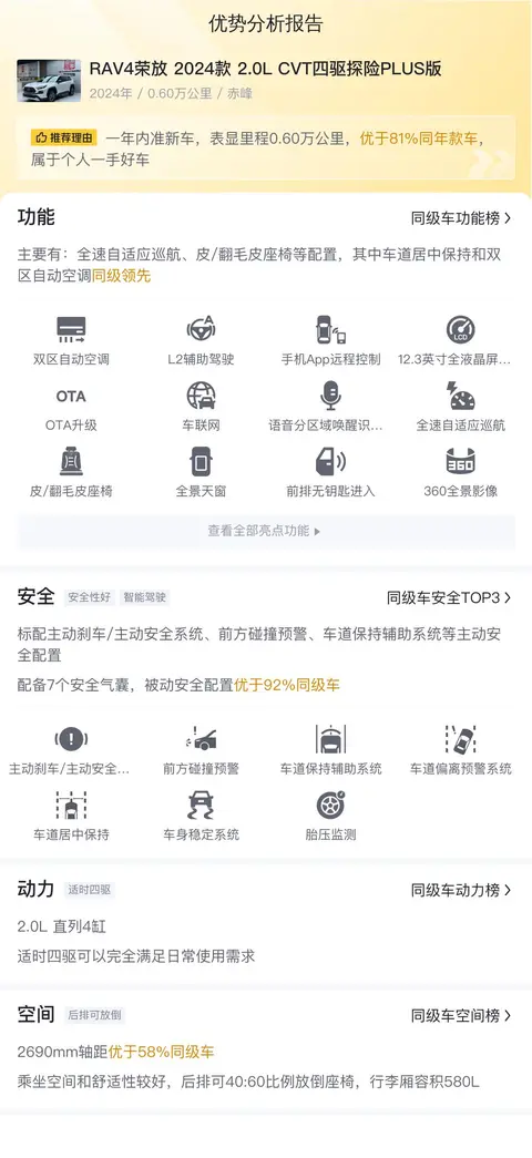 据估算,RAV4荣放 2024款 2.0L CVT四驱探险PLUS版的平均用车成本是5966元/年,毕竟是油车,所以用车成本不算低。