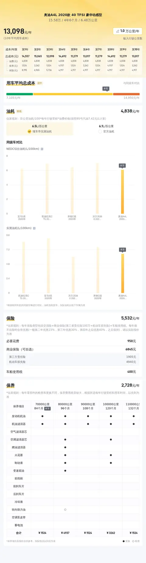 除了价格,大家可能还会关注这款车的使用成本。根据懂车帝的数据分析,奥迪A4L 2020款 40 TFSI 豪华动感型的年均综合使用成本大约为每年1.3万元左右。当然,这个数字也会根据您的具体使用情况和维护习惯有所变动。但是大体也够您参考了。