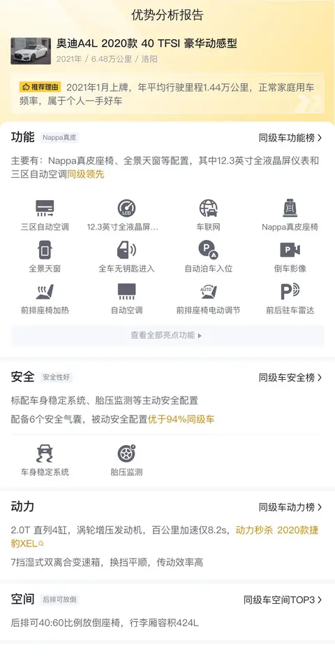动力方面,奥迪A4L 2020款 40 TFSI 豪华动感型搭载了2.0T直列4缸涡轮增压发动机,百公里加速仅需8.2秒,7挡湿式双离合变速箱保证了换挡的平顺性和高效的传动效率。在对比2020款捷豹XEL等竞品时,A4L在动力响应、燃油经济性和舒适性配置上均表现出色,特别是Quattro系统在冰雪路面的稳定性优势和较高的二手市场保值率,使其成为消费者购买豪华中级轿车时的重要选项。