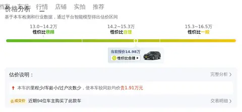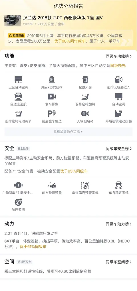 根据懂车帝的数据,这辆车的售价在14.27万至17.57万之间,而当前车主给出的价格为14.98万,这一价格不仅符合市场区间,而且相较于同车系均价有8%的优势,显示出较高的性价比。考虑到这辆车公里数较少,且为一手车,这一价格更为合理。根据懂车帝的大数据分析,这辆车预计再行驶2年后,仍能保持10.7万的售价,这一保值率在同级别车型中处于前列,展现了汉兰达作为一款经典SUV的市场认可度和保值能力。
