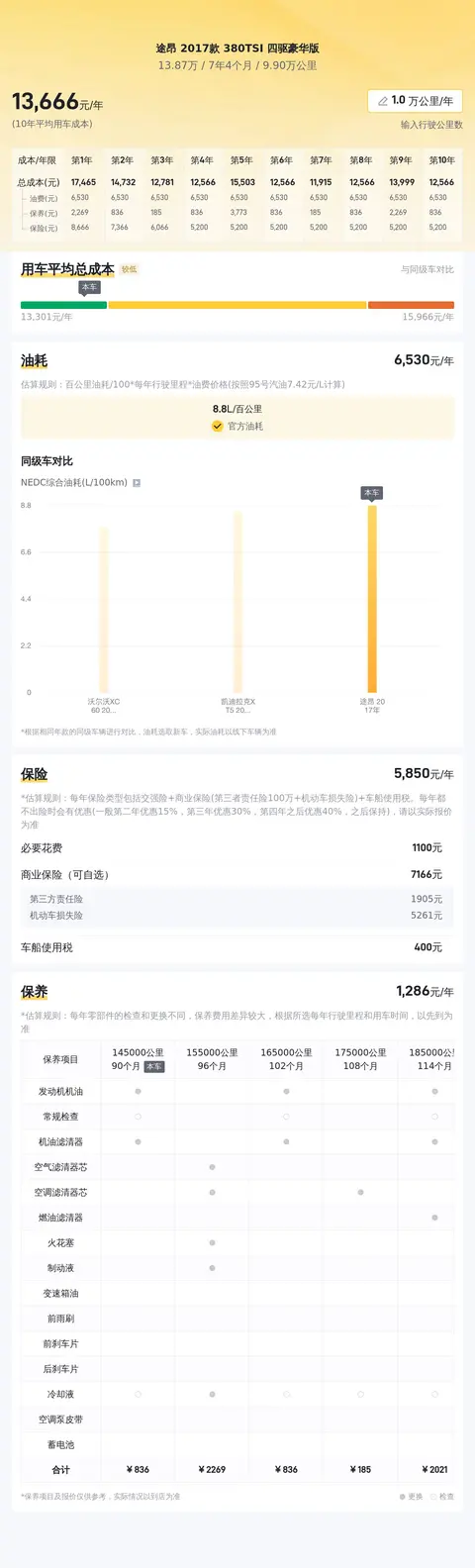 根据大数据分析,这辆途昂 2017款 380TSI 四驱豪华版的售价在14.02至17.49万元之间,具体售价因车况而异。这辆车的售价为13.87万元,车况良好,里程适中,属于合理售价范围之内。用车成本方面,按照每年行驶1万公里计算,包括保险、保养和燃油费用在内,预计每年用车成本约为14680元,具体费用根据实际使用情况和保养情况而定。