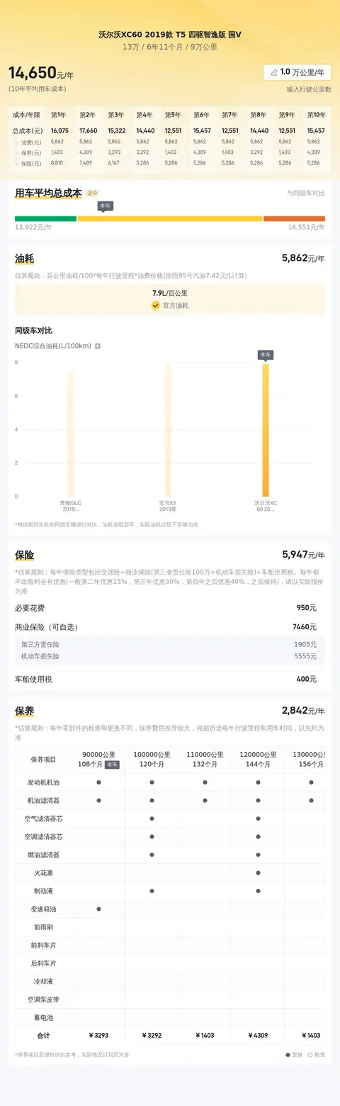 用车成本方面,根据官方数据,该车的百公里油耗为7.9升。按照每年行驶2万公里、油价8.02元/L计算,预计每年油费支出为12,640元。保险方面,预估每年保费约为5,688元,包括交强险、商业险(第三者责任险100万+机动车损失险)以及车船使用税。保养方面,预计每年的保养费用约为2,688元,涵盖了常规保养和零部件更换等。需要注意的是,实际用车成本可能会因个人驾驶习惯、用车频率、油价波动等因素而有所差异。在购买二手车时,请务必考虑自身的经济能力和实际用车需求,制定合理的用车预算。