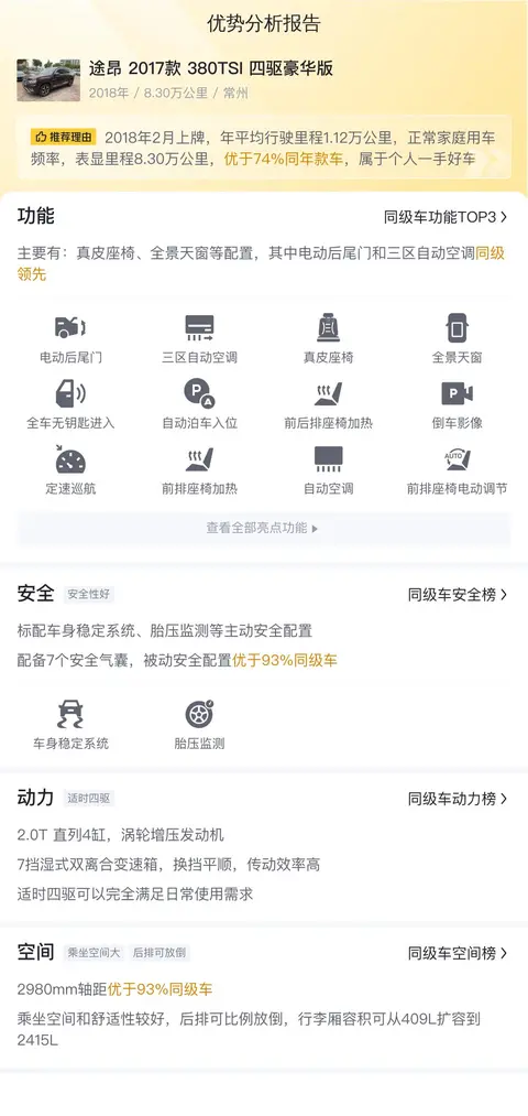 综上所述的新车含税价、用车成本、市场行情、优势分析、同款比价等数据仅供参考。在配置部分,因为二手车非标品,车辆可能会存在配置改装的情况,具体车况信息需要线下结合车辆实际情况进行综合参考。