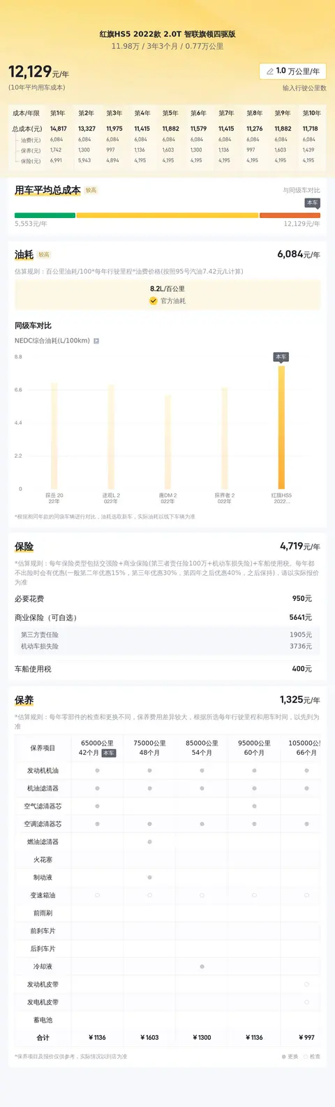 关于用车成本,根据估算,这辆车的年均综合用车成本大概在每年1.2万元左右,需要注意的是,实际用车成本还是要根据车辆的实际使用情况而定。