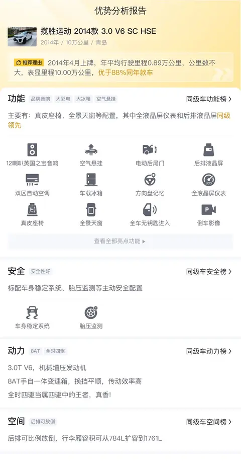 另外,同级车的最低10年平均用车成本是18533元/年,最高是46714元/年,揽胜运动 2014款 3.0 V6 SC HSE是25180元/年,用车成本适中,不占优势。