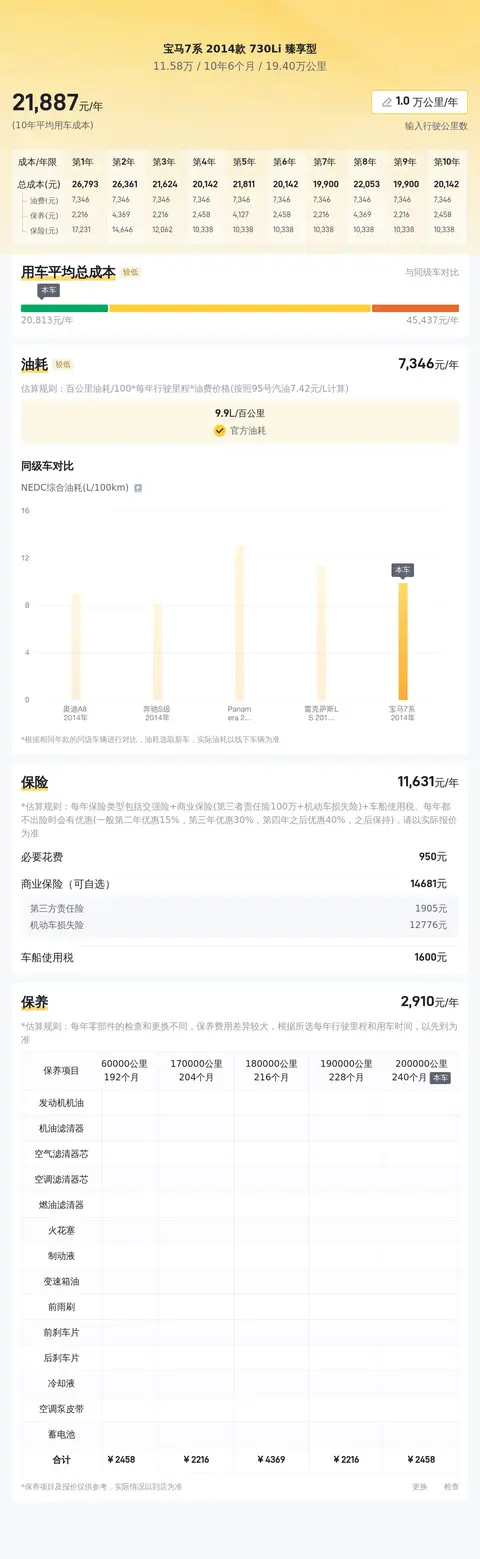 按照每年行驶1万公里计算,这辆宝马七系2014款730Li臻享型的年均综合用车成本约为21688元。虽然这一成本在同级别车型中相对较高,但考虑到其豪华配置和出色性能,这一成本仍在合理范围内。