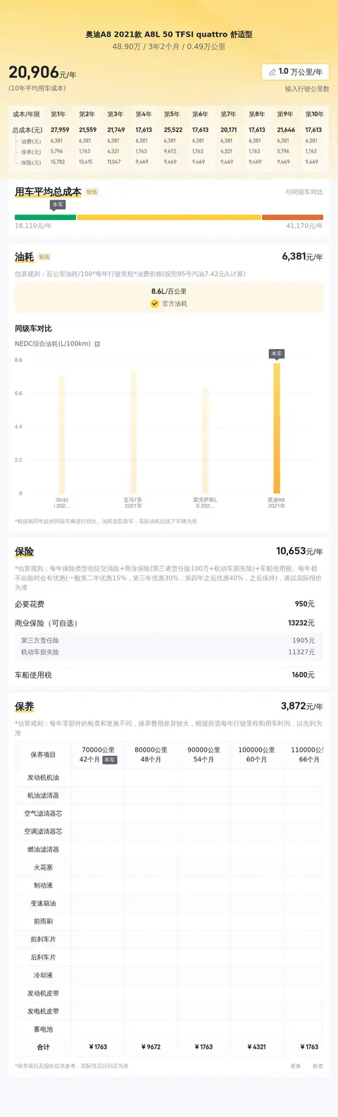 关于用车成本,我们从几个方面进行了分析。首先,油耗成本相对较低,根据车主反馈和官方数据,这辆奥迪A8的百公里油耗大约为8.6L,考虑到其动力性能和车身重量,这一油耗表现相当不错。其次,保险成本适中,预计每年的保险费用约为11665元,这在同级别车型中属于合理范围。再次,保养成本较低,每年的保养费用大约为4110元,这得益于奥迪良好的制造质量和合理的保养政策。最后,融资成本方面,如果您选择贷款购车,当前市场利率下,贷款利息会增加一部分成本。总体而言,这辆奥迪A8的用车成本在同级别豪华车中属于较低水平,这对于追求高品质生活同时又注重经济性的消费者来说,无疑是一个很好的选择。