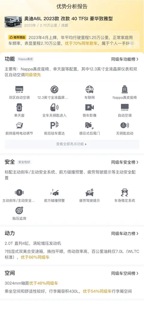 综上所述,这辆二手奥迪A6L 2023款改款40 TFSI豪华致雅型在外观、内饰、空间和动力等方面的表现都还不错。特别是其内饰和空间体验给人留下了深刻的印象。不过需要注意的是,由于该车没有检测报告,所以无法对车况进行详细的了解。如果您真的感兴趣,一定要实地试驾体验,并仔细观察车辆的状况。同时也要结合自己的预算和需求来进行综合考虑。毕竟购买二手车是一项重要的决策,需要慎重对待。最后希望您早日找到自己心仪的车型,享受驾驶的乐趣。