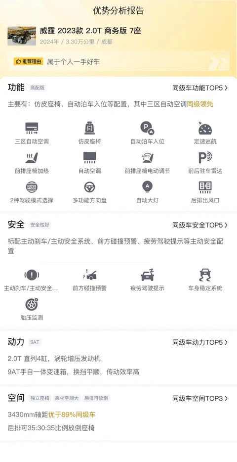 毕竟是2023款的车,所以配置也不会差到哪里去。威霆 2023款 2.0T 商务版 7座配备了仿皮座椅、三区自动空调、前排座椅记忆、自动泊车入位等配置。安全配置上,标配主动刹车/主动安全系统、前方碰撞预警、车道保持辅助系统等主动安全配置,同时配备的8个安全气囊,使其被动安全配置优于87%同级车。其中的自动泊车入位,老司机可能不屑一顾,但对于新手而言,肯定是一个好帮手,从此和停车难说拜拜。