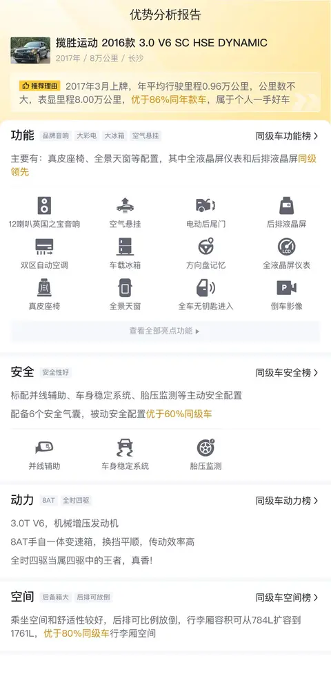 这辆2016款路虎揽胜运动3.0 V6 SC HSE DYNAMIC是一辆黑色车身的二手车,上牌日期为2017年3月,上牌地及车源地均为长沙,至今行驶里程为8万公里,该车未曾过户。新车指导价为109.8万元,现卖家报价为27.8万元。