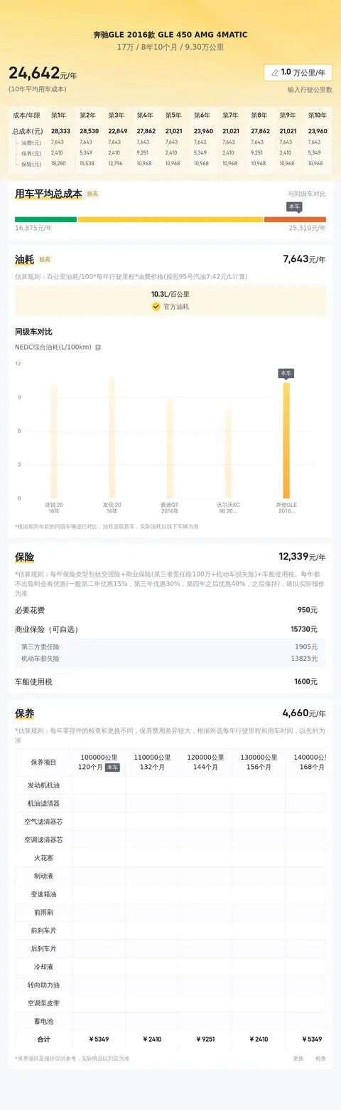 根据懂车帝的大数据分析,奔驰GLE 2016款 GLE 450 AMG 4MATIC的10年平均持有成本大概是25273元/年,6年平均持有成本大概是25708元/年,5年平均持有成本大概是26109元/年,4年平均持有成本大概是26770元/年。