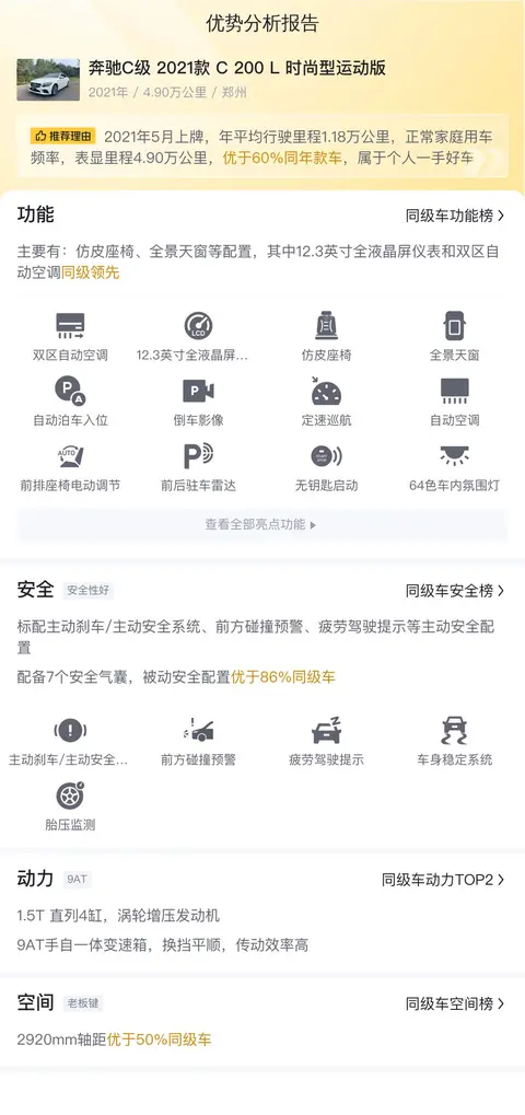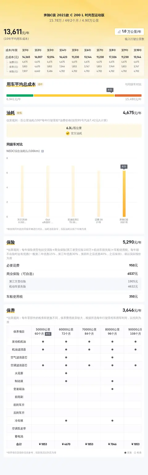 据估算,同级车用车成本最低12466元/年,最高15276元/年,奔驰C级 2021款 C 200 L 时尚型运动版的用车成本是14180元/年,用车成本适中。