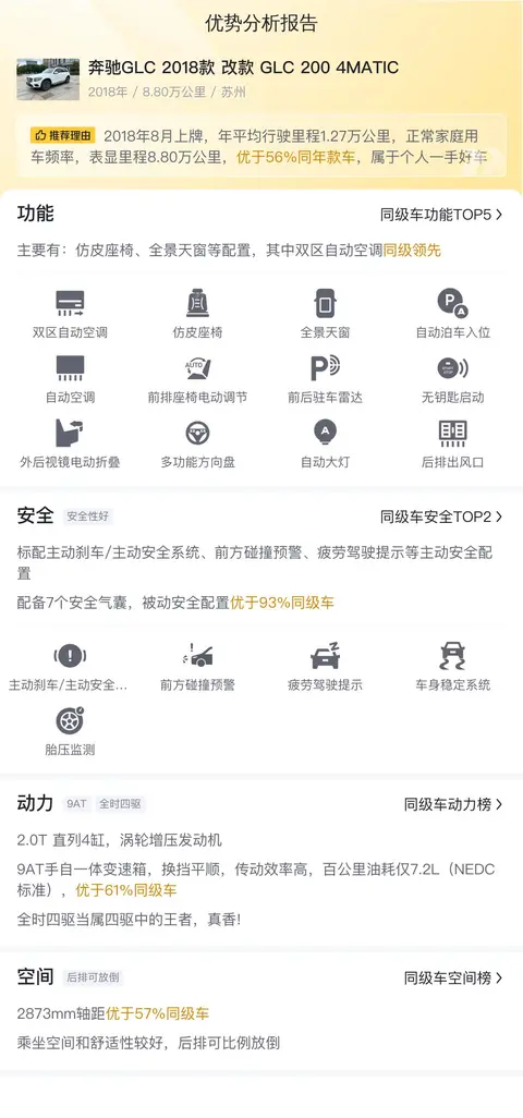 咱们先了解下这辆二手奔驰GLC 2018款 改款 GLC 200 4MATIC的基础信息,这样心里也有底。目前该车的表显里程是8.8万公里,新车指导价39.48万,二手车报价14.28万,2018年8月首次上牌,期间0过户,车源地跟上牌地都是苏州,车身颜色为白色。