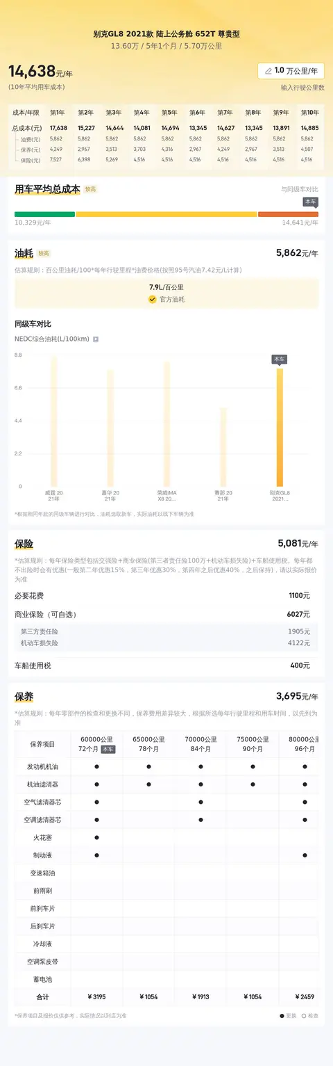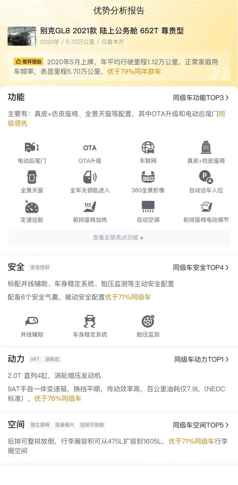 别克GL8 2021款 陆上公务舱 652T 尊贵型可作为商务接待用车,也可以作为家庭用车。考虑到用车成本、市场行情、优势分析、同款比价等数据,结合这辆车的车况信息,目前13.6万的售价比较合理。由于这辆车没有检测报告,很多车况信息无法证实,建议实地试驾和验车,再做购买决策。