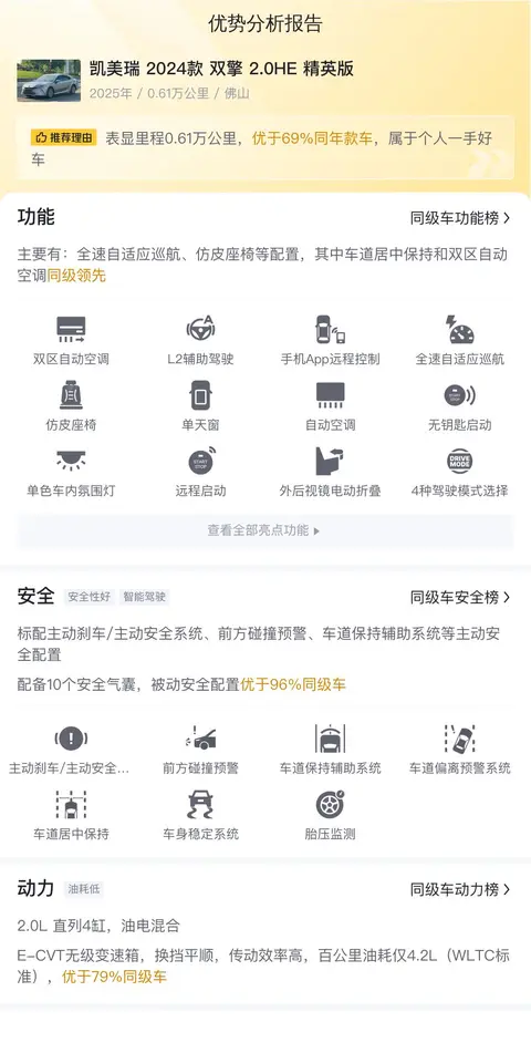 今天我们要介绍的这款凯美瑞 2024款 双擎 2.0HE 精英版是一款中型车,车身外观颜色为香槟色,内饰是深色配色。车源地和上牌地都是佛山。2025年6月首次上牌,在此期间过户0次。新车含税价为19.42万,而现在的二手车报价仅为14.68万,比新车价格便宜了4.74万。目前该车行驶里程是6100公里,国VI排放标准,油耗是4.2L,前驱驱动,天窗类型是单天窗。