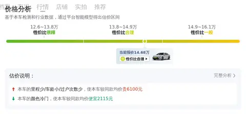 车价会受到很多因素的影响,像车龄、里程、过户次数等,根据懂车帝大数据分析,这款车的售价在14.68万到17.34万之间,而咱们要说的这辆车报价14.68万,这个价格在市场中是什么水平呢?往下看就知道了。