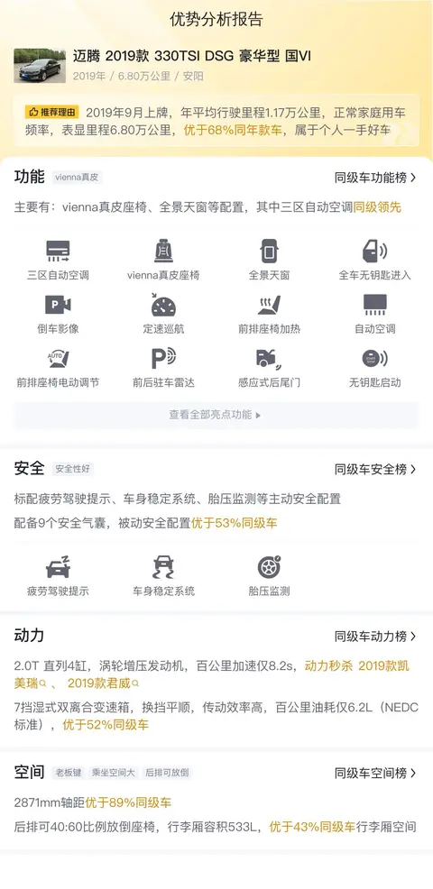 综上所述,这辆2019款迈腾330TSI DSG豪华型国VI的二手车状况良好,里程适中,且无过户记录,再加上较低的售价,无疑是一款性价比较高的选择。但需要注意的是,该车目前未提供第三方检测报告,有意者需实地考察并试驾,进一步验证车况。