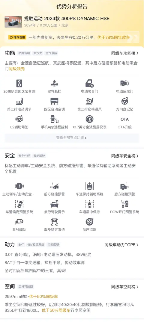 毕竟是2024款的车,所以配置很顶。揽胜运动 2024款 400PS DYNAMIC HSE配备了空气悬架、全速自适应巡航、后方碰撞预警、HUD抬头显示、第二排电动调节等配置。安全配置上,标配主动刹车/主动安全系统、前方碰撞预警、车道保持辅助系统等主动安全配置,配备6个安全气囊,被动安全配置优于55%同级车。