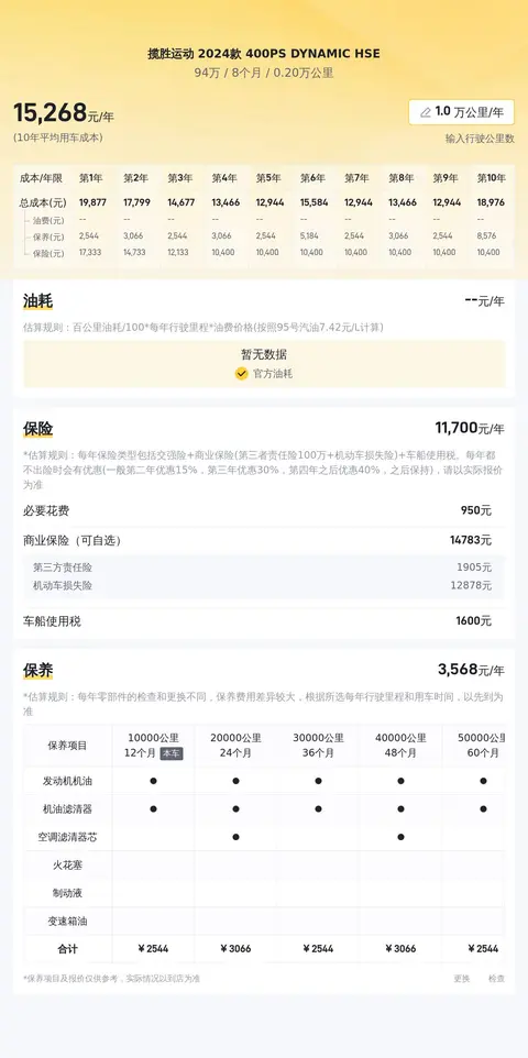 据估算,揽胜运动 2024款 400PS DYNAMIC HSE的用车成本是31251元/年,同级车的最低是21860元/年,最高是43981元/年,所以它的用车成本不算低。