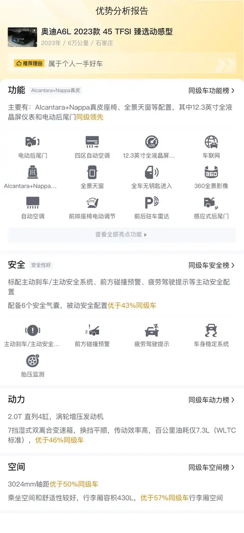这辆奥迪A6L 2023款 45 TFSI 臻选动感型,按照每年行驶里程2.00万公里计算,10年平均用车成本约15183元/年,而同级车最低10808元/年,最高21782元/年,它的用车成本合理。
