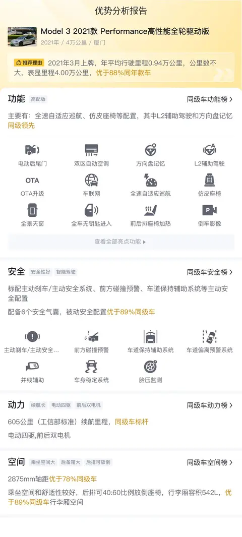 综上所述,这辆二手Model 3 2021款 Performance高性能全轮驱动版在车况、配置、动力和能耗等方面表现出色,且价格合理。在做出购买决策之前,请确保对车辆进行全面的了解和评估,以确保它符合您的需求和预算。