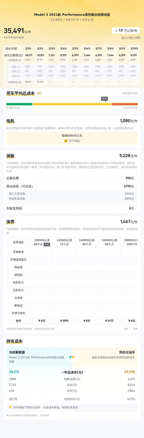 根据懂车帝的数据,这辆Model 3的售价在14.65万至17.57万之间,具体价格因车况而异。在当前车况下,该车报价具有一定的竞争力。根据估算,这辆车的年均综合用车成本约为3.5万元,其中包括电费、保险费和保养费等。