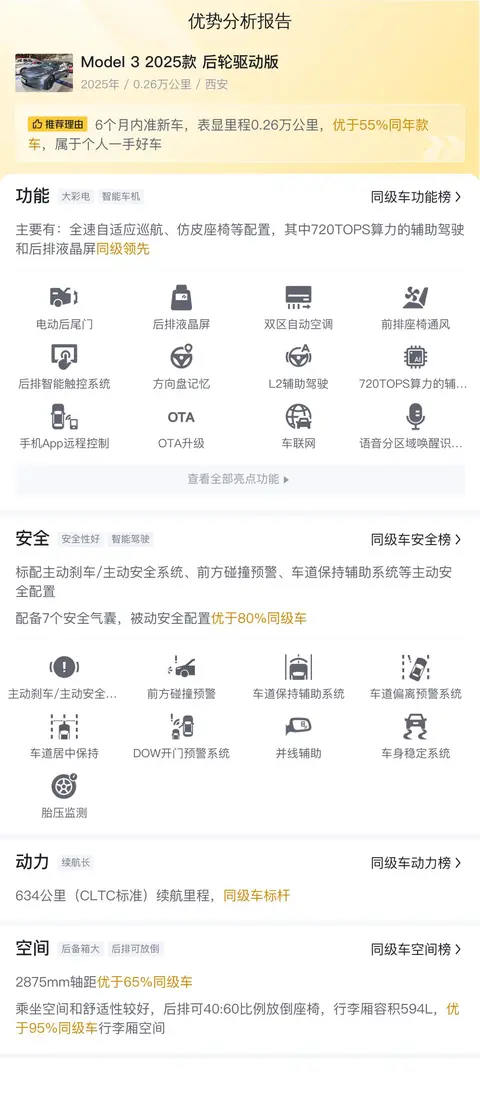综上所述,这辆Model 3 2025款 后轮驱动版是一辆里程少、车龄新的纯电动轿车。它在配置、性能、空间和用车成本方面都表现出色,适合那些追求环保、科技和舒适性的消费者。然而,潜在买家也应考虑到其作为纯电动车型的局限性,以及未来技术更新可能对保值率产生的影响。尽管如此,以19.68万元的价格购买这样一辆里程仅为2.6万公里的纯电动轿车,无疑是一个极具性价比的选择,特别适合用作家庭第二辆车。