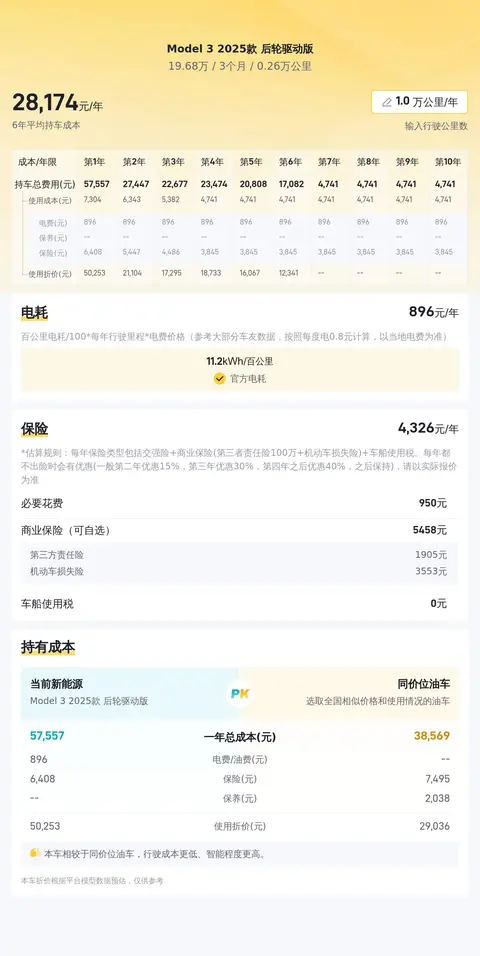 根据懂车帝大数据分析,这辆Model 3 2025款 后轮驱动版的预估价值在16.75万元至19.97万元之间,而实际报价为19.68万元,落在了这一合理区间内。考虑到它较低的里程数和良好的保养状况,这一报价似乎是合理的。此外,根据估算,这辆车的十年平均用车成本约为每年2.84万元,这一数字基于当前市场数据和车辆参数,但实际花费可能会根据个人使用习惯和电费价格波动而有所不同。