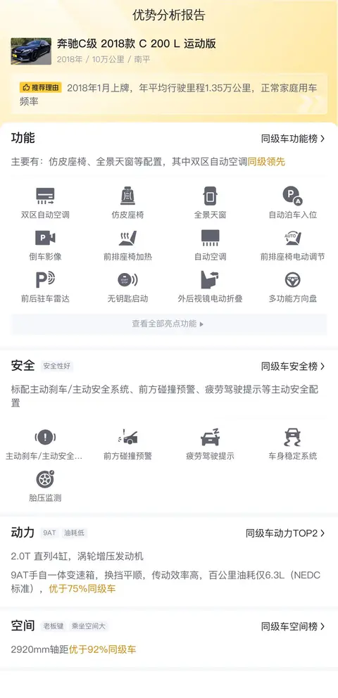 优势:奔驰C级 2018款 C 200 L 运动版的市场行情价是13.72万-16.97万,它的报价则是11.98万,所以报价在市场行情中偏低。配置齐全,动力也不错,空间宽敞,适合家用。