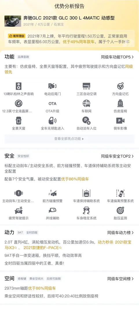 另外,同级车的最低10年平均用车成本是13364元/年,最高是19373元/年,奔驰GLC 2021款 GLC 300 L 4MATIC 动感型是17173元/年,表现居中。