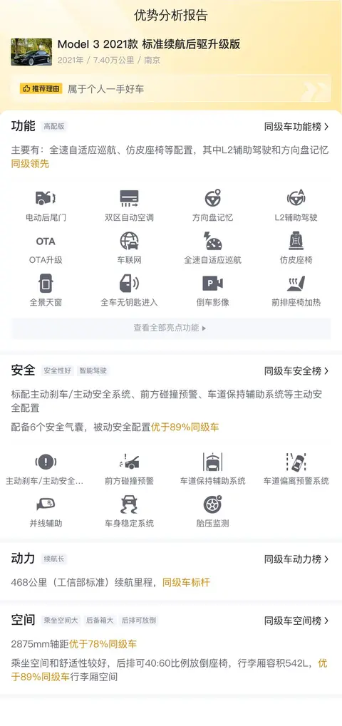 综上所述,这辆二手特斯拉 Model 3 2021 款标准续航后驱升级版凭借其合理的售价、良好的车况、先进的技术和环保特性,成为了一款极具吸引力的电动车型。对于那些追求环保、科技和性价比的消费者来说,它无疑是一个值得考虑的选择。然而,购买二手车时也需注意潜在的问题,如电池健康度、续航能力和维修成本等,建议通过专业检测和深入了解后再做决定。
