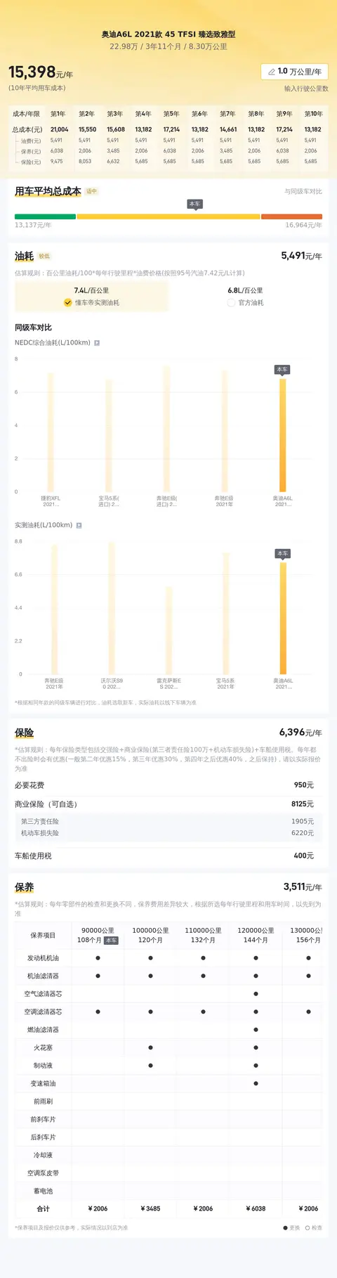 从该车3年多的平均用车成本来看,按每年行驶一万公里计算,这辆车的平均用车成本约为15187元,与同级别车相比费用适中,主要得益于油耗表现优于82%同级车,在油耗方面节省了不少开支。