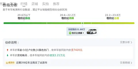 车况说完了,我们聊聊行情,毕竟买车也是需要真金白银的。当前这款车的二手车市场行情大约在21.62万至25.77万元之间,当然具体的价格还要考虑车辆的状况、行驶里程、使用年限等因素。至于本车的售价,商家报价21.88万元,价格相对较低,是一个不错的选择。在用车成本方面,该车官方公布的WLTC综合油耗为7.97L/100km。我们按照每年行驶2万公里、当前油价计算,您每年约有13166元燃油费用支出,每年约有5880元保险费用,以及约1882元保养费用,平均每天约有51.2元用车成本支出。以上就是在车况良好状态下,大致的用车成本情况,具体金额还是要以实际使用情况为准。