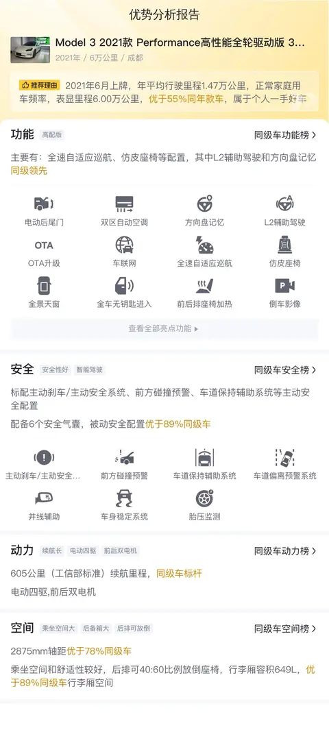 这辆二手特斯拉Model 3 Performance,车源地跟上牌地都是成都,上牌日期2021年6月,过户次数是未过户。该车表显里程6万公里,按照常规理解,家用车一般一年一万公里左右,三年三万公里属于正常磨损,这台车三年六万公里,刚好符合家用正常值,至于具体细项损耗,需要看实车确认,不过从目前已知的公开信息,也可以初步了解一下这台车的基础情况。