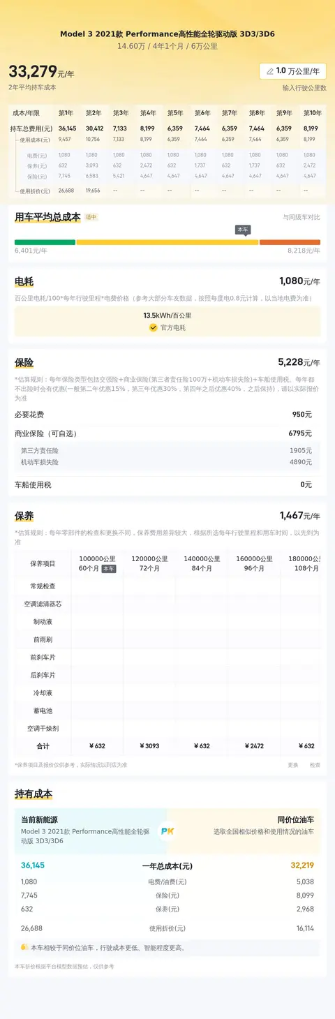 在考虑购买一辆二手车时,除了购车成本外,还需要合理预期日常使用和保养的费用。基于目前这台二手Model 3的大数据分析结果,您的年均综合使用成本预计在3万元左右。这一估值已考虑到电费、保险费用以及可能的保养或维修成本等因素。请记住,实际花费可能会根据车辆使用频率、维护状况及个人驾驶习惯等因素有所变动。
