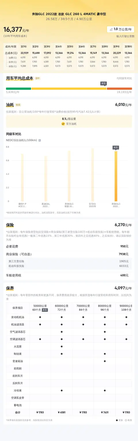 据估算,同级车的最低用车成本是6506元/年,最高是18799元/年,奔驰GLC 2022款 改款 GLC 260 L 4MATIC 豪华型是15718元/年,所以用车成本较高。