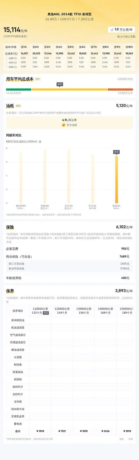 根据大数据分析,这款奥迪A6L 2014款 TFSI 标准型的市场价格在10.8万左右。考虑到其车况良好、里程短等因素,这个价格具有一定的竞争力。从用车成本来看,按照每年行驶1万公里计算,10年平均用车成本约为15189元/年,其中油费约6085元/年,保险费用约5647元/年,保养费用约为458元/年。这些数据仅供参考,具体费用可能会根据使用情况和市场价格波动而有所不同。