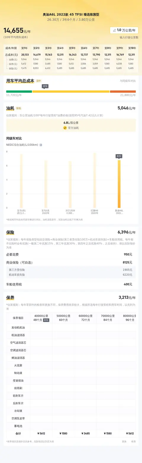 根据大数据分析,这辆奥迪A6L的售价在众多同款车型中极具竞争力,不仅符合市场预期,甚至有望成为性价比之王。从用车成本角度来看,该车的平均年费用约为1.5万元,这一数字在豪华B级车市场中属于合理范围,对于追求高品质生活的消费者而言,这样的投入无疑是物有所值的。