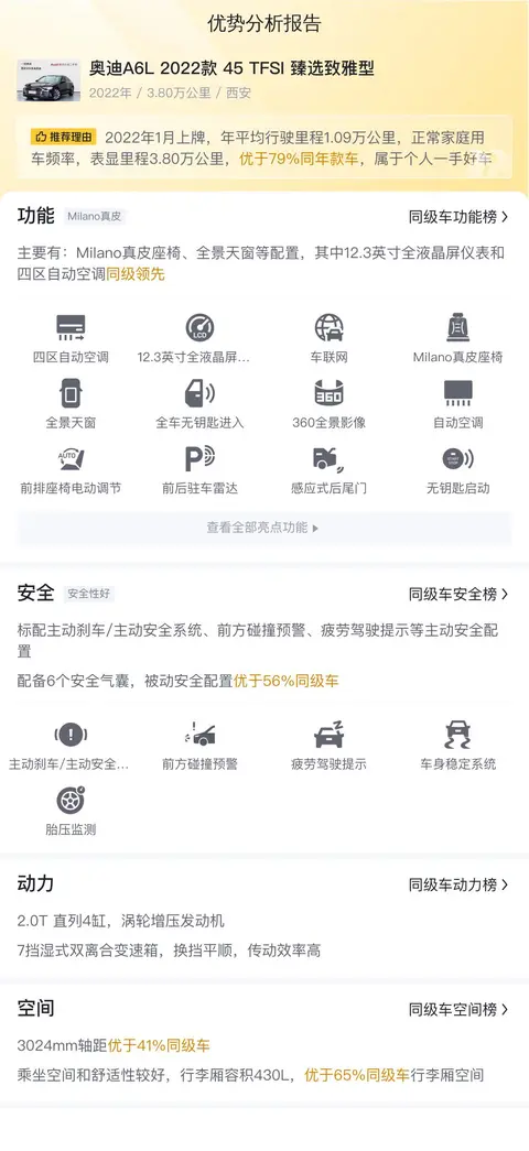 综上所述,这辆二手奥迪A6L 2022款 45 TFSI 臻选致雅型以其优惠的价格、可靠的车况、出色的性能配置以及合理的用车成本,成为了市场上的焦点。它不仅能满足您日常出行的需求,更能提升您的生活品质。如果您正在寻找一款性价比高的豪华B级车,那么这辆奥迪A6L无疑是您的理想之选。需要提醒的是,文中提及的车况信息需要结合车辆实际情况进行综合参考,具体车况还需现场查看。