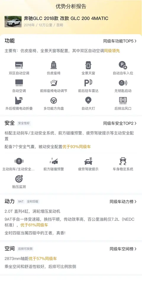 据估算,同级车的最低用车成本是15978元/年,最高是18766元/年,奔驰GLC 2018款 改款 GLC 200 4MATIC是16338元/年,所以用车成本适中。