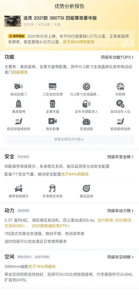 综上所述的新车含税价、用车成本、市场行情、优势分析、同款比价等数据仅供参考。在配置部分,因为二手车非标品,车辆可能会存在配置改装的情况,具体车况信息需要线下结合车辆实际情况进行综合参考。