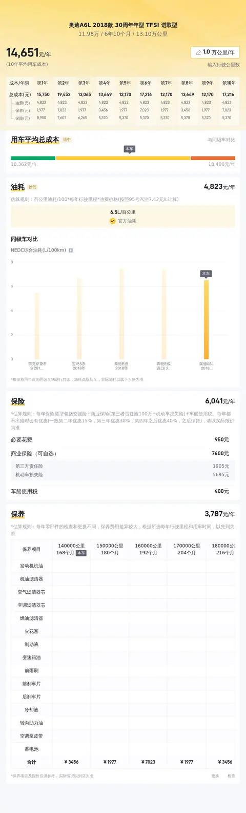 根据懂车帝官方的大数据分析,这辆奥迪A6L 2018款 30周年年型 TFSI 进取型的10年平均用车成本约15,479元/年,而该车10年平均用车成本约15,188元/年,用车成本较低,经济性较好。