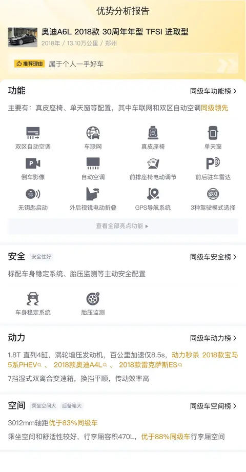 这辆奥迪A6L 2018款 30周年年型 TFSI 进取型报价低于市场行情,经济性比较好,配置也比较丰富,在同级别车型中具有一定的竞争力,且奥迪A6L作为豪华中大型车的代表之一,一直以来都以其出色的性能、精致的内饰和丰富的配置受到消费者的喜爱,所以这辆车还是值得考虑的。但是二手车一车一况,一况一价,对于没有检测报告的二手车,建议您实地查看,确保车况没问题再购买。