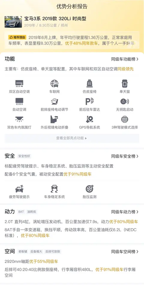 这辆宝马3系的具体版本是2019款 320Li 时尚型,上牌日期2019年6月,跑了8.3万公里,国VI排放标准。车源地和挂牌地都是郑州,白色车身,未过户。新车指导价31.68万,目前二手车报价10.58万。