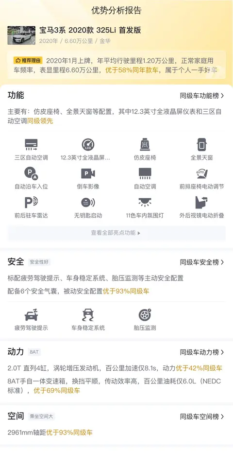 根据懂车帝的数据,这台宝马3系2020款325Li首发版的综合性价比指数为72%,这意味着它的车况、价格和价值在同级别二手车市场中处于较为优秀的位置。在当前车况下,该车的售价设定在13.8万元,相较于新车指导价32.39万元,为购买者带来了显著的成本节约,特别是在里程数相对较少的情况下。关于用车成本方面,该车型的百公里油耗大约为6升,按照常规使用频率计算,每年的油费支出大约为5679元。此外,保险费用通常每年约为5109元,而保养费用则估计每年约为2370元。这些数字提供了一个大致的年度用车成本概览,当然实际费用可能会根据个人使用习惯及车辆维护状况有所变动。