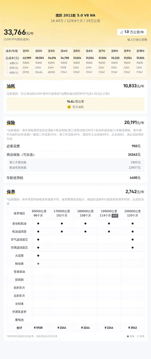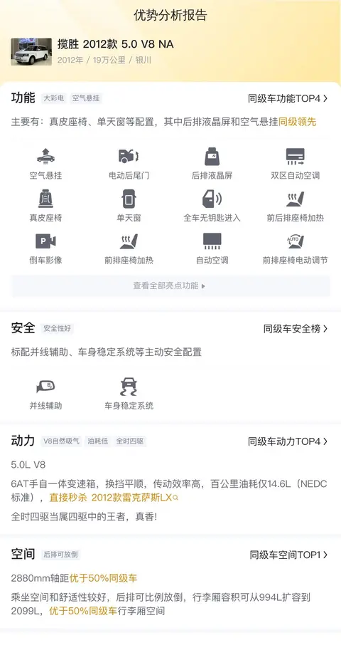 优势:价格很吸引人,16.6万就能买到当初近200万的快乐,想想都美滋滋。而且这款揽胜 2012款 5.0 V8 NA的里程并不算高,动力允许,油耗也合理,别看是V8的发动机,但是油耗甚至不如现在一些2.0T的发动机。