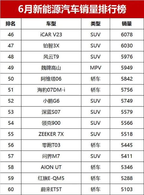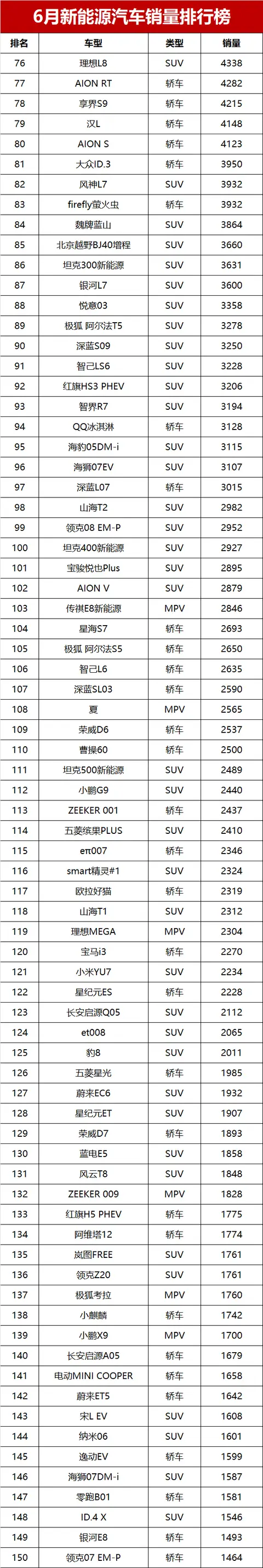 星愿、秦PLUS新能源、秦L、海鸥等四款销量排名第二至第五位,6月销量分别为40891辆、38618辆、31304辆和30708辆。宋PLUS新能源、宏光MINIEV、小米SU7(图片|配置|询价)、海豹06、问界M8等五款车型销量均超过2万辆,排名第六至第十位。其中,宋PLUS新能源是6月新能源紧凑型SUV销量冠军,宏光MINIEV是微型车销量冠军,小米SU7是中大型车销量冠军,而问界M8则是大型SUV销量冠军。