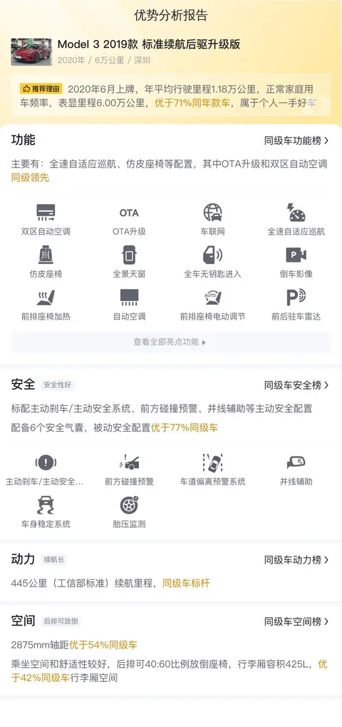 在当前二手车市场上,这辆二手特斯拉Model 3 2019款 标准续航后驱升级版的售价颇具竞争力。根据懂车帝的大数据分析,该车系在全国纯电紧凑型车销量榜Top7,且本车价格在全国同款车型中处于较低水平,保值率较高。同时,该车的里程、车龄和过户次数均优于同类车型,进一步提升了其性价比。对于追求性价比和科技体验的消费者来说,这辆车无疑是一个极佳的选择。