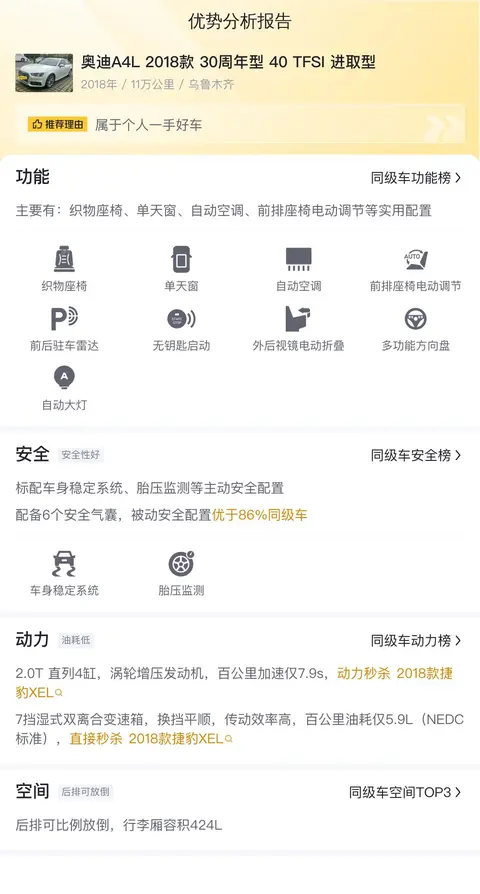 这辆二手车经过检测,外观有轻微瑕疵,但并不影响正常使用。车况良好,非重大事故车、火烧车或泡水车,配置实用且安全。动力强劲,油耗合理,驾乘感受舒适且空间宽敞。市场行情和用车成本均表现出一定的竞争力。总的来说,如果你正在寻找一辆性价比高、车况良好且配置丰富的二手车,那么这辆奥迪A4L 2018款 30周年年型 40 TFSI 进取型绝对是一个值得考虑的选择。