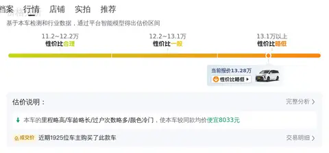 根据大数据预估显示,这辆车的市场行情在13.22万-16.52万之间,而当前的报价为13.28万,价格比较低,值得考虑。